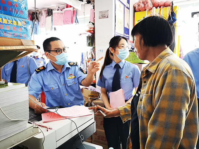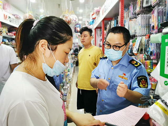 日前,区市场监管局高新区分局开展校园及周边儿童和学生用品质量安全专项检查。图为该分局执法人员正对商户进行法律宣传,指导对方签订“守法经营”的承诺书。