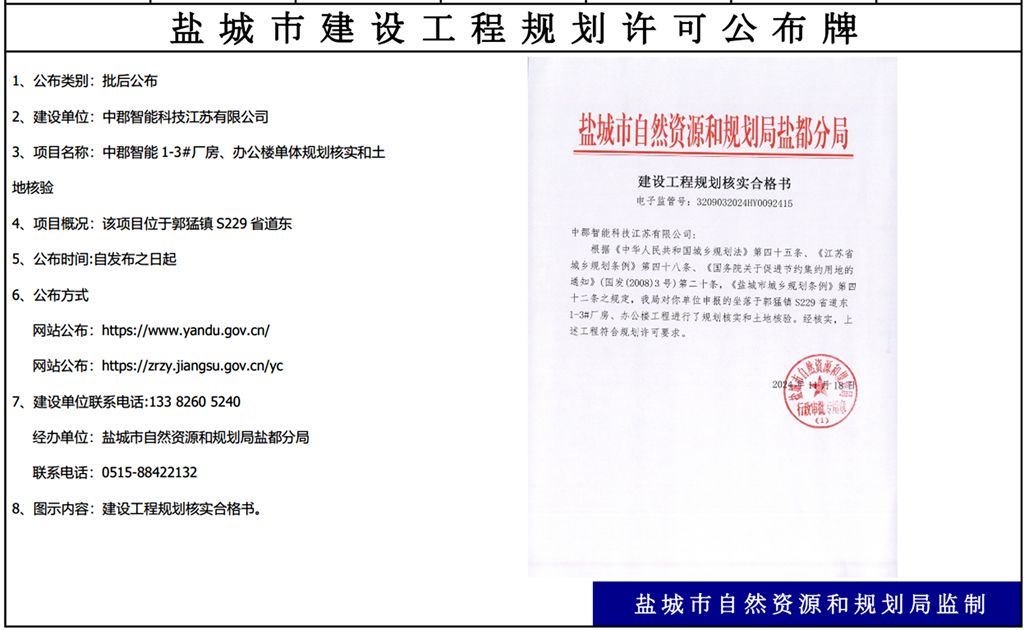 中郡智能科技江苏有限公司中郡智能1-3#厂房、办公楼单体规划核实和土地核验批后公布