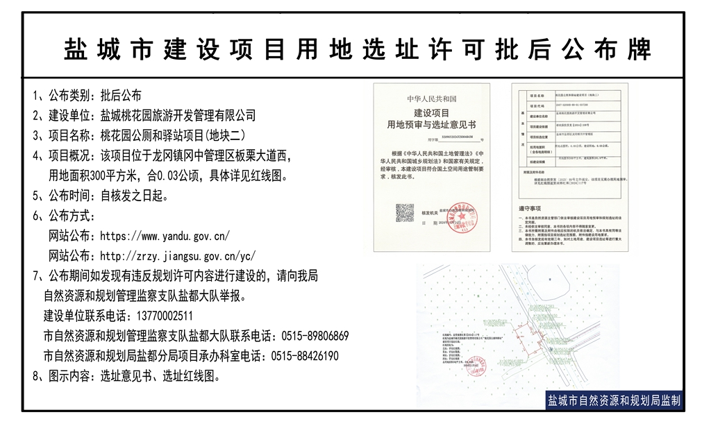 盐城市桃花园旅游开发管理有限公司桃花园公厕和驿站项目(地块二)核发用地预审与选址意见书批后公布