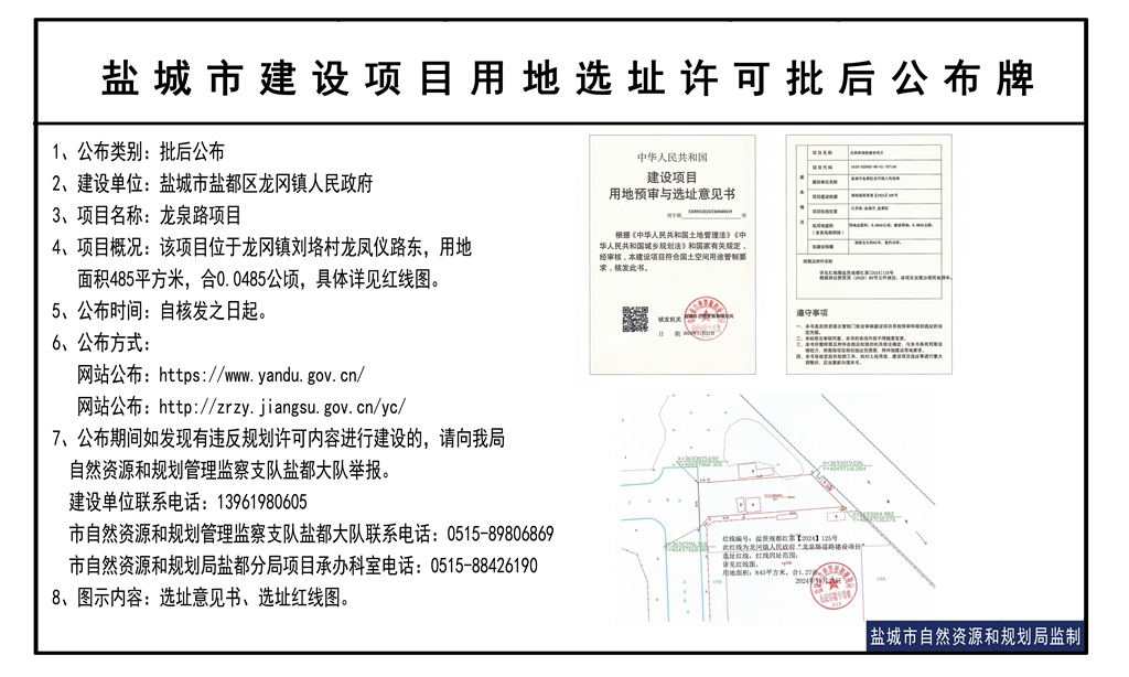 盐城市盐都区龙冈镇人民政府龙泉路项目核发用地预审与选址意见书批后公布