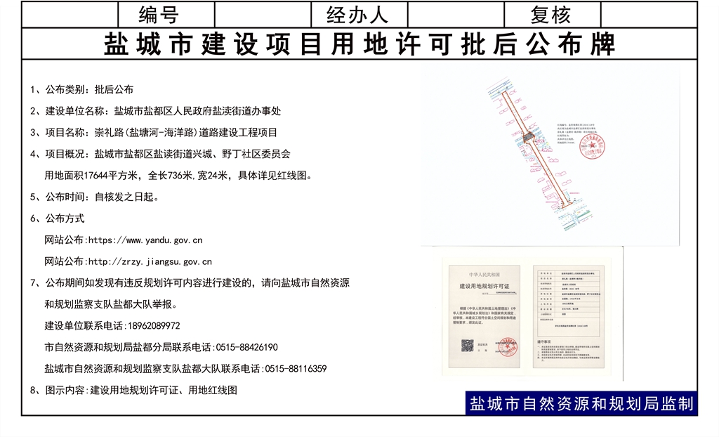 盐渎街道办事处崇礼路(盐塘河-海洋路)道路建设工程项目核发建设用地规划许可证批后公布