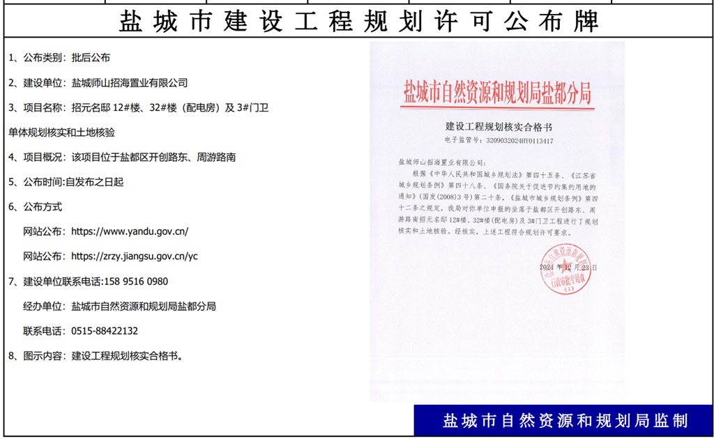 盐城师山招海置业有限公司招元名邸12#楼、32#楼(配电房)及3#门卫单体规划核实和土地核验批后公布
