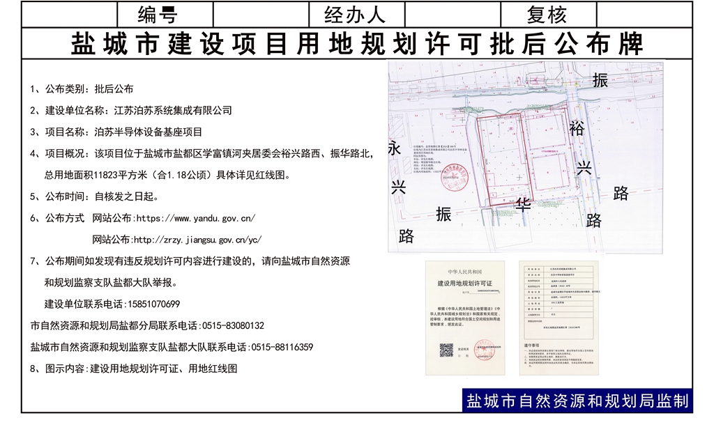 江苏泊苏系统集成有限公司泊苏半导体设备基座项目核发建设用地规划许可证批后公布