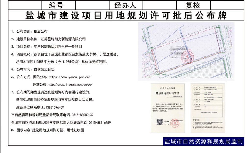 江苏昱辉阳光新能源有限公司年产10GW光伏组件生产一期项目用地批后公布