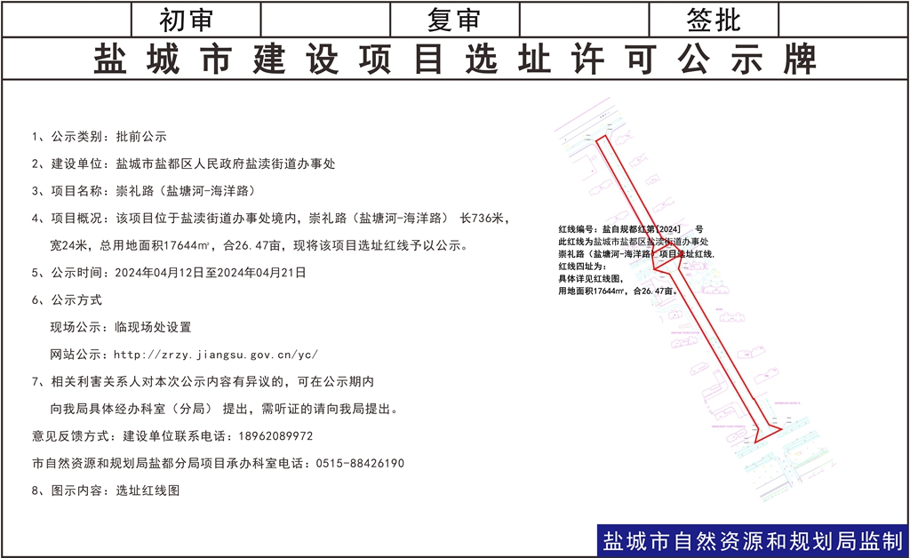 盐城市盐都区人民政府盐渎街道办事处崇礼路(盐塘河-海洋路)选址批前公示
