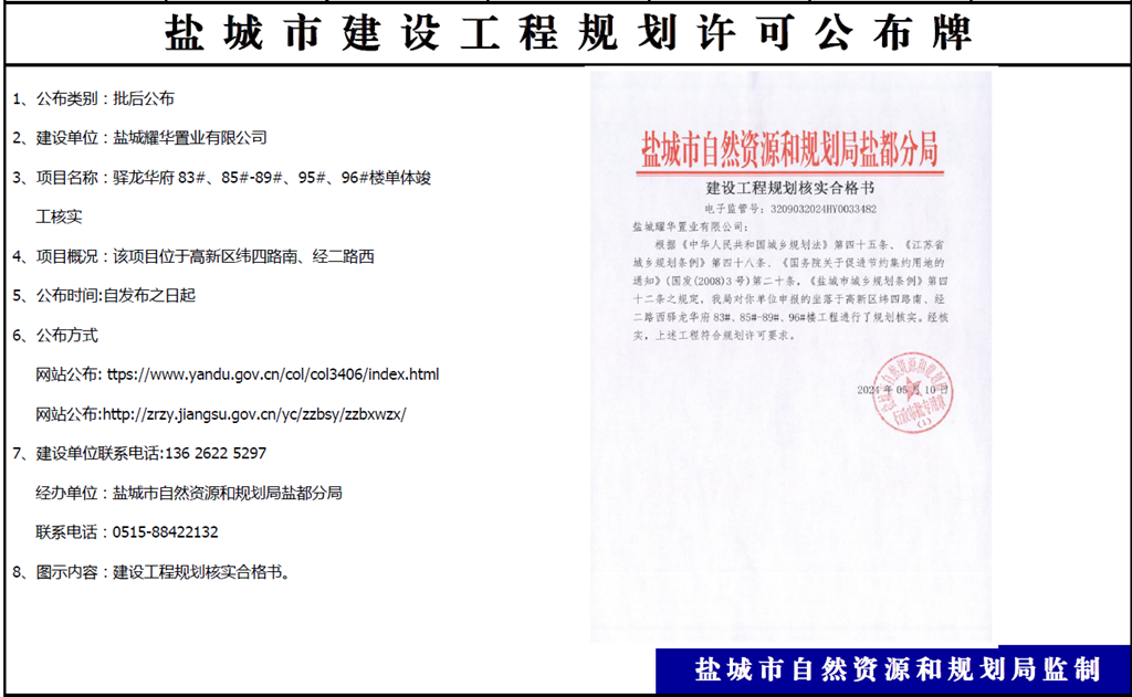 盐城耀华置业有限公司驿龙华府83#、85#-89#、95#、96#楼单体竣工核实批后公布