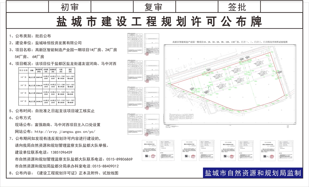 盐城咏恒投资发展有限公司高新区智能制造产业园一期项目1#厂房、2#厂房、5#厂房、6#厂房发证批后公告
