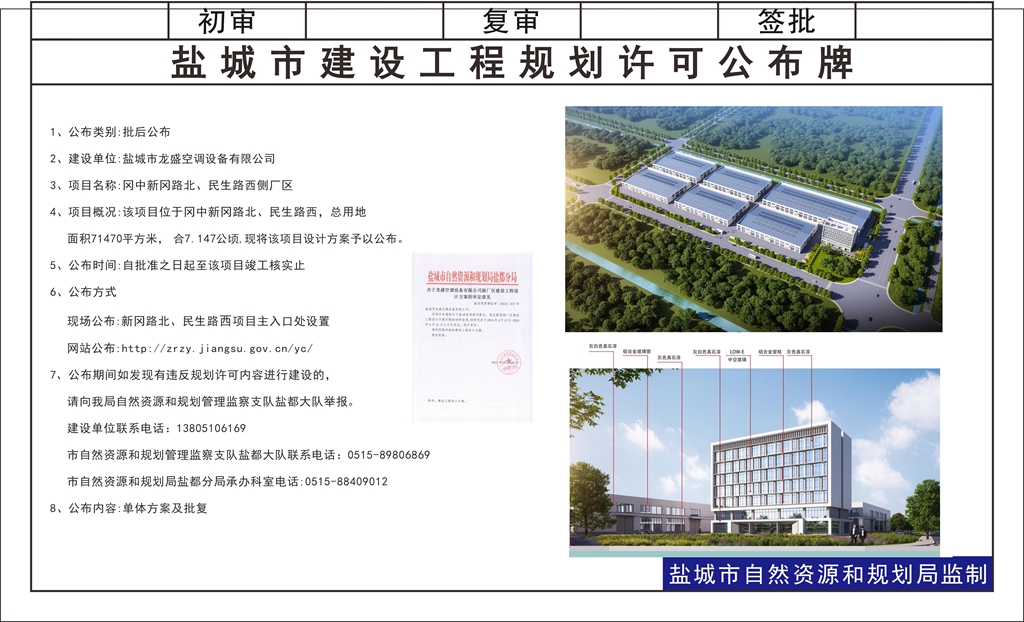 盐城市龙盛空调设备有限公司冈中新冈路北、民生路西侧厂区设计方案批后公布