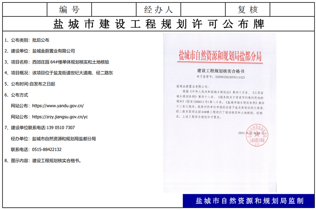盐城金蔚置业有限公司西郊庄园64#楼单体规划核实和土地核验批后公布