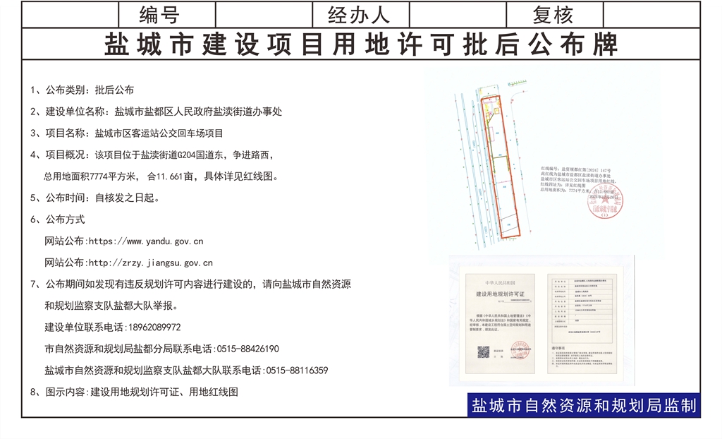 盐城市盐都区人民政府盐渎街道办事处盐城市区客运西站公交回车场项目核发建设用地规划许可证批后公布