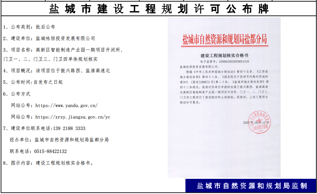 盐城咏恒投资发展有限公司高新区智能制造产业园一期项目开闭所、门卫一、二,门卫三、门卫四单体规划核实