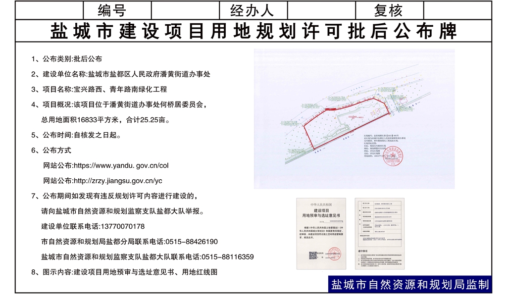 盐城市盐都区人民政府潘黄街道办事处宝兴路西、青年路南绿化工程用地批后公告
