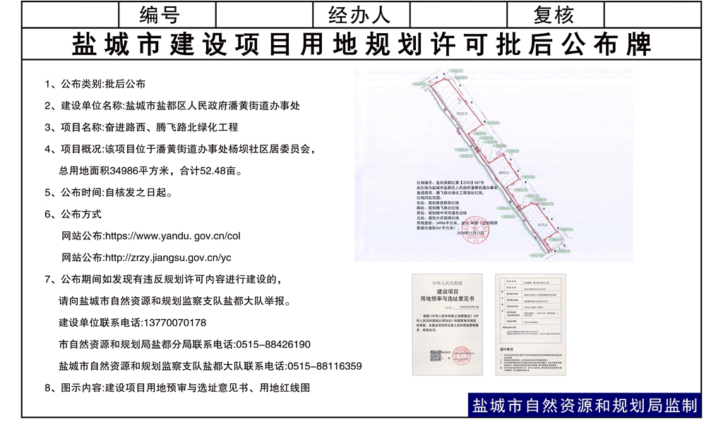 盐城市盐都区人民政府潘黄街道办事处奋进路西、腾飞路北绿化工程用地批后公告