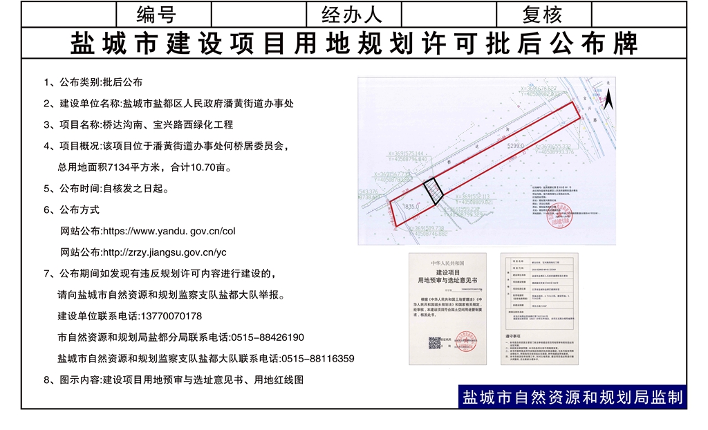 盐城市盐都区人民政府潘黄街道办事处桥达沟南、宝兴路西绿化工程用地批后公告