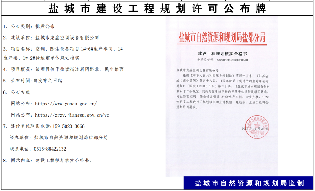 盐城市龙盛空调设备有限公司空调、除尘设备项目1#-6#生产车间、1#生产楼、1#-2#传达室单体规划核实批后公布