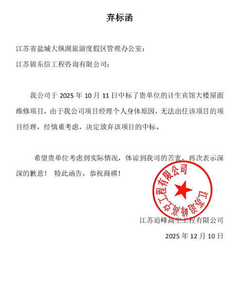 我单位于2025年12月10日收到江苏追峰高空工程有限公司的弃标承诺书,其主动放弃本次招标项目中标人资格,故本项目作流标处理。重新招标的信息将在盐城市盐都区人民政府网上发布,请各潜在投标人及时关注。