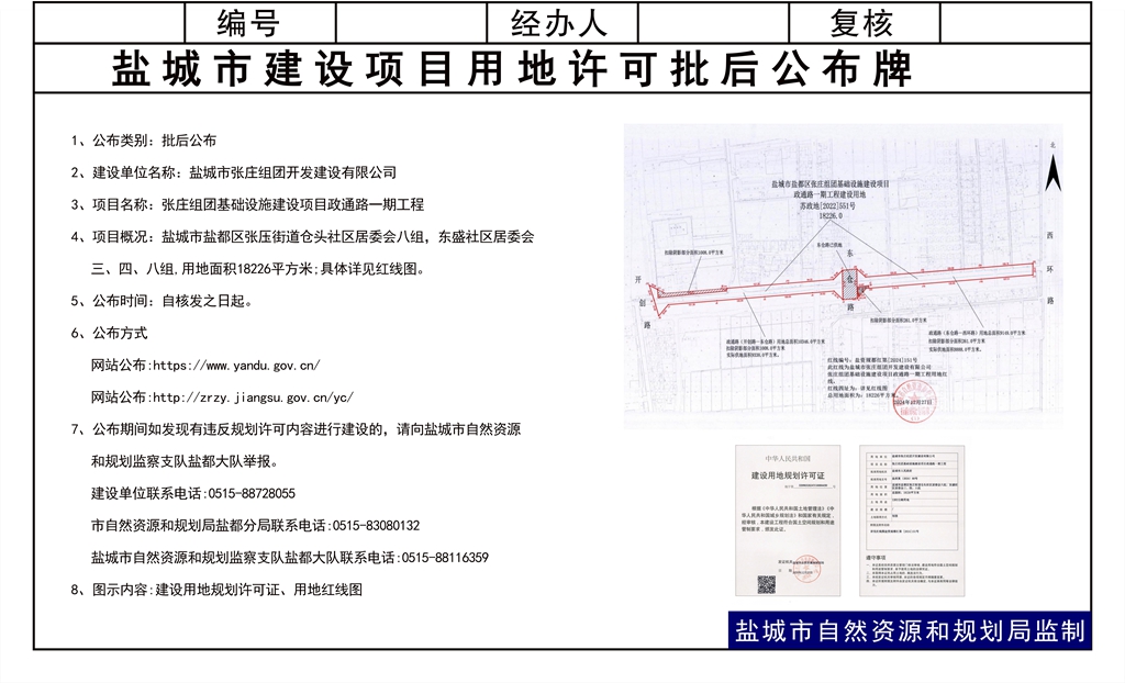 盐城市张庄组团开发建设有限公司张庄组团基础设施建设项目政通路一期工程核发建设用地规划许可证批后公布