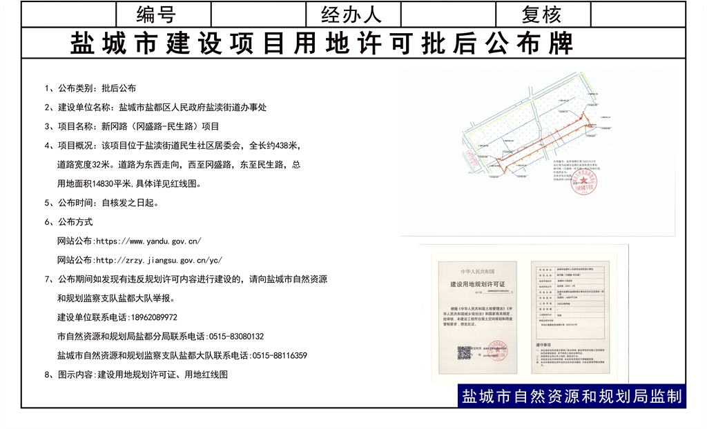 盐城市盐都区人民政府盐渎街道办事处新冈路(冈盛路-民生路)项目核发建设用地规划许可证批后公布