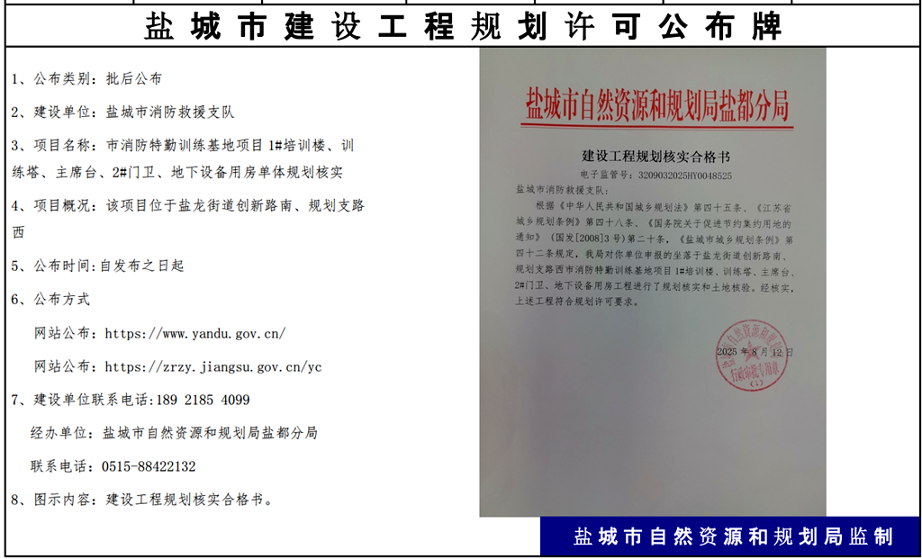 盐城市消防救援支队消防特勤训练基地项目1#培训楼、训练塔、主席台、2#门卫、地下设备用房单体规划核实批后公布