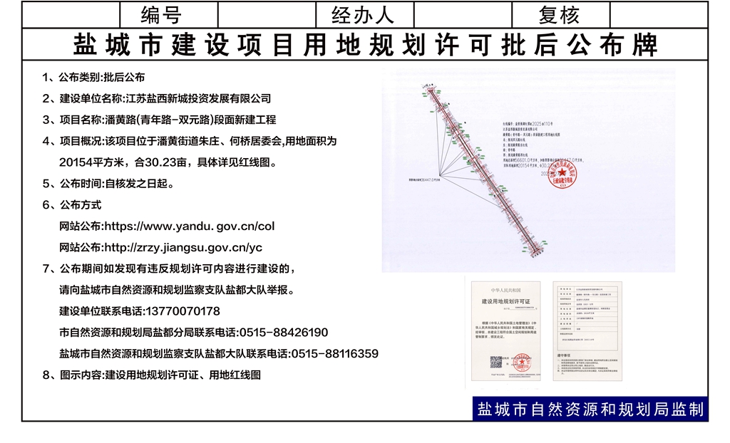 江苏盐西新城投资发展有限公司潘黄路(青年路--双元路)段面新建工程用地批后公告