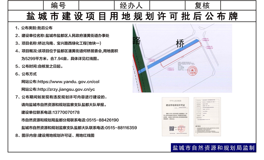 盐城市盐都区人民政府潘黄街道办事处桥达沟南、宝兴路西绿化工程(地块一)用地批后公告