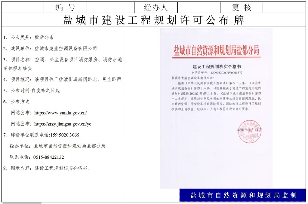盐城市龙盛空调设备有限公司空调、除尘设备项目消防泵房、消防水池单体规划核实批后公布