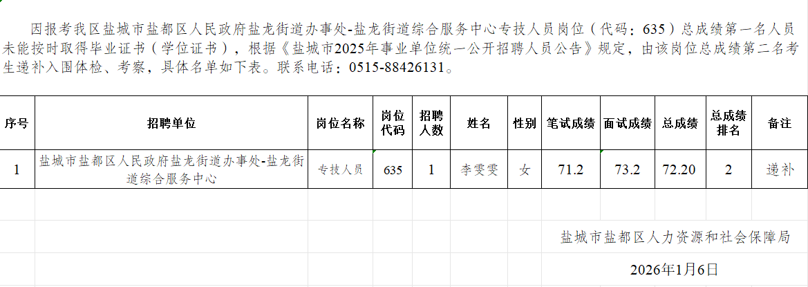 关于公布盐都区2025年部分事业单位统一公开招聘人员递补体检考察人员名单的通知