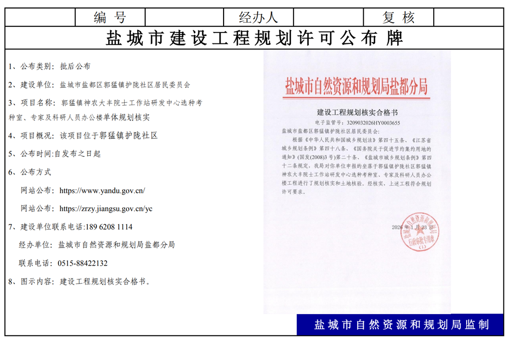 盐城市盐都区郭猛镇护陇社区居民委员会郭猛镇神农大丰院士工作站研发中心选种考种室、专家及科研人员办公楼单体规划核实批后公布