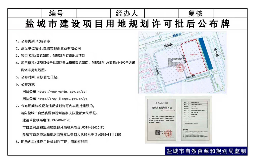 盐城市都南置业有限公司致远路南、创智路东67亩地块项目核发建设用地规划许可证批后公布