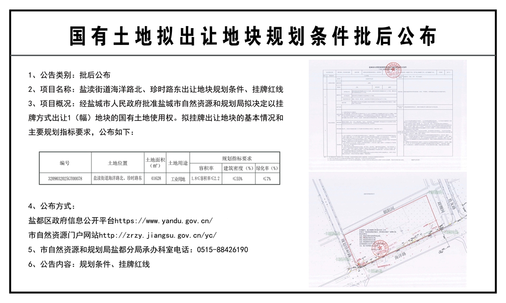 盐城市盐都区人民政府盐渎街道办事处海洋路北、珍时路东4.1628公顷地块核发规划设计条件批后公布