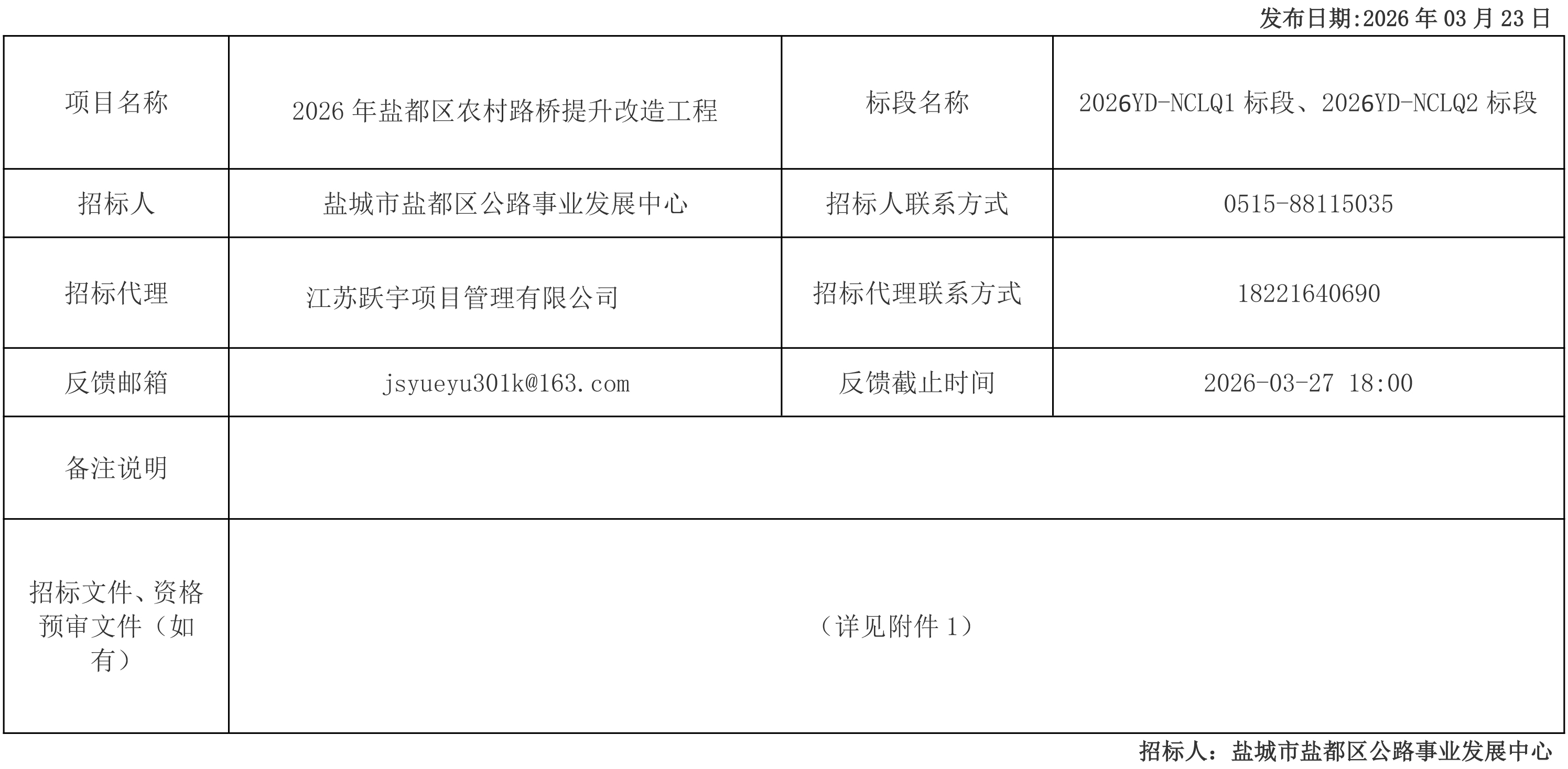 2026年盐都区农村路桥提升改造工程招标文件提前公示