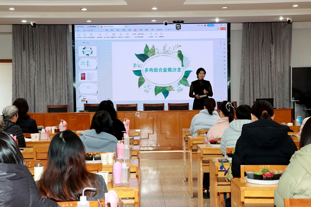 活动现场,专业花艺师细致讲解花卉知识、插花技巧与多肉植物养护常识,并解答女职工的花艺疑问。创作环节,女职工们在花艺师指导下将花材、绿植打造成各具特色的花艺作品。创作完成后,部分女职工分享创作思路与心得,大家相互欣赏交流,全体人员手持作品在背景板前合影留念。