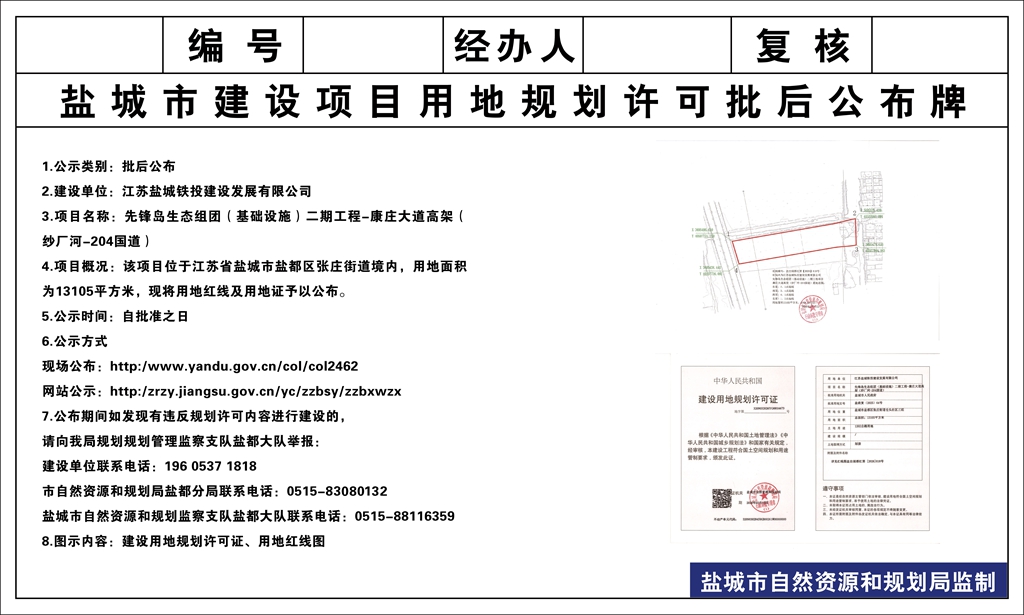 江苏盐城铁投建设发展有限公司先锋岛生态组团(基础设施)二期工程-康庄大道高架(纱厂河-204国道)核发建设用地规划许可证批后公布