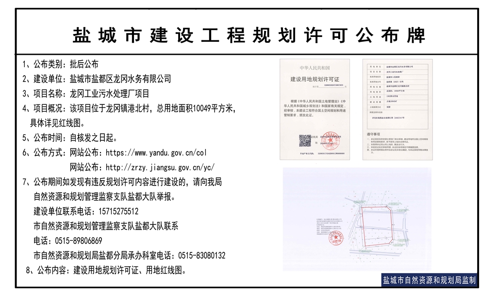 盐城市盐都区龙冈水务有限公司龙冈工业污水处理厂项目核发建设用地规划许可证批后公布