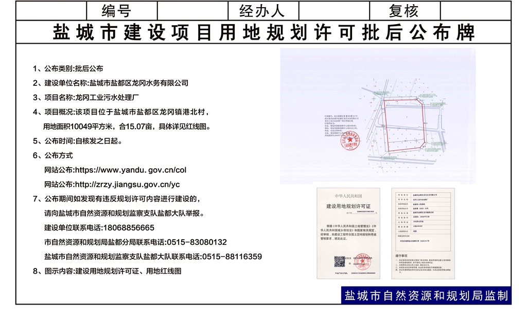 盐城市盐都区龙冈水务有限公司龙冈工业污水处理厂用地批后公告