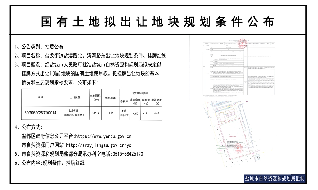 盐城市盐都区人民政府盐龙街道办事处盐渎路北、滨河路东2.6019公顷核发规划条件批后公布