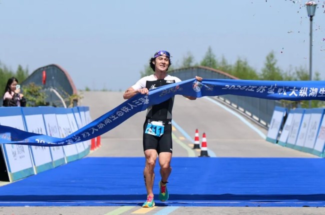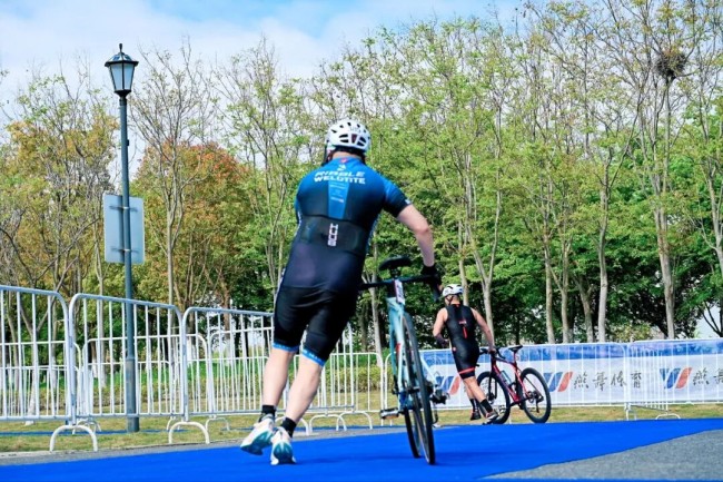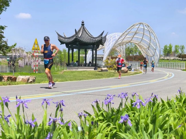 上午8时30分,随着发令声响起,参赛选手竞相跳入水中,正式开启1.5公里游泳赛程。完成游泳赛段后,选手们迅速转换装备,沿着风光旖旎的蟒蛇河水上文化生态廊道,开启44公里的沿河自行车骑行,途经花海长堤、生态绿道,在清风拂面中感受盐都水乡的灵动与惬意;随后,选手们转入10公里的生态跑步赛段,在草木葱茏的河畔奋力冲刺,真正实现了“一步一景,一程一画卷”。